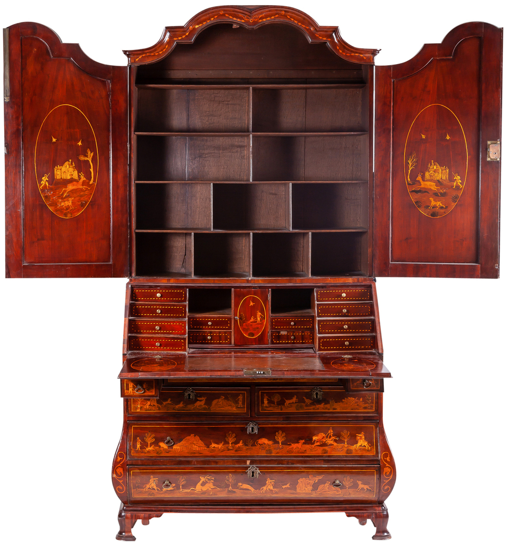 A Dutch fruitwood marquetry mahogany bureau-cabinet decorated with hunting scenes, 18th Century 230 x 55 x 120 cm 5.000 - 6.000 €